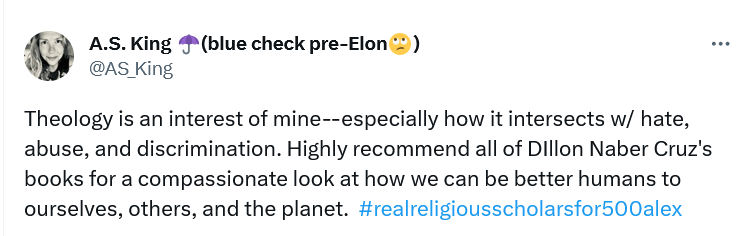 It’s not often that I get to name drop because I’m a somewhat obscure progressive theologian who lives and writes in a small Pennsylvania city. That said though, I am lucky enough to be friends with the brilliant, multi-award winning author A.S. King. Her novels take on some of the most important issues of our day such as white supremacy, fascism and authoritarianism, transphobia and homophobia, patriarchy, spousal abuse, teen rights, literacy, and book banning. King is incredibly intellectually curious and despite not being a Christian, sees the importance of theology because faith impacts the lives of believers and non-believers alike both culturally, and politically. In other words, even atheists should see the importance of theology and be intellectually curious enough to see what progressive theologians have to say about contemporary issues such as white supremacy, anti-LGBTQIA bigotry, climate change, history, fascism, etc. With that in mind, be like A.S. King, read theology, and speak up for the marginalized.