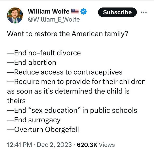Wolfe’s true motivation, controlling women, is clear with the next two items on his list. He wants to make abortion illegal while also reducing contraception. One would think that logically speaking someone who actually cared about the number of abortions would want INCREASED access to contraception, but no, these androcratic authoritarians simply want to control what women do with their bodies. This list tells me that William Wolfe wants to force women to be pregnant and to stay at home as 1950s style homemakers.