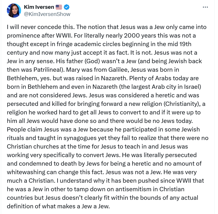Recently, a woman named Kim Iversen, sent out a tweet that has since been seen by over 3.5 million people. She is a media personality, having hosted shows on multiple radio stations, and now finds herself on Rumble the alt-right video platform. In her tweet, Iversen stated that “the notion that Jesus was a Jew only came into prominence after World War II.” I’m sorry, what??? A tweet this absurd perhaps shows us why Ms. Iversen finds herself on Rumble these days instead of working for a reputable network. The only times I have ever seen someone make the claim that Jesus wasn’t actually Jewish is by Neo-Nazis and other antisemitic white supremacists. I don’t know if Iversen is a white supremacist, Neo-Nazi, but she is spouting the same kind of rhetoric that they do. She also claimed that Jesus “was considered a heretic and was persecuted and killed for bringing forward a new religion (Christianity), a religion he worked hard to get all Jews to convert to and if it were up to him all Jews would have done so and there would be no Jews today.” Again, this is not only demonstrably false, but patently ridiculous.