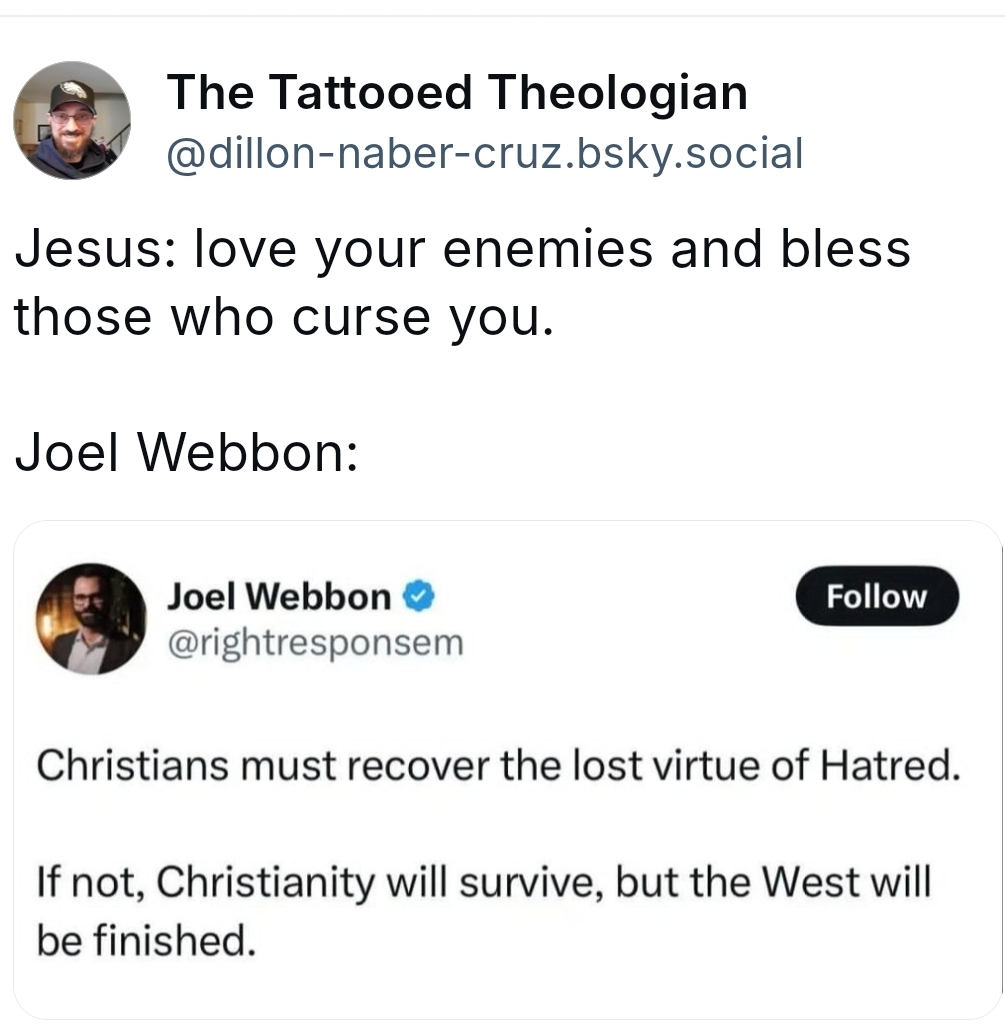 Webbon came to my attention a couple of years ago on Twitter. I would see his antichrist tweets and comment on them occasionally. Last year, I did a deep dive into Webbon’s YouTube videos in order to feature him on the God Squad Podcast. It made me feel icky and I definitely need a raise for putting myself through that, but I digress. Here is a sampling of things that Webbon teaches: people receiving or performing abortions should be murdered, women should not have the right to vote, wives should only read books her husband approves of, America needs a dictator like a Protestant version of Franco or an American Caesar, that it would be merciful to shoot and kill immigrants approaching the U.S. border in order to prevent more from coming, and that he wants to reward his friends and crush his enemies. Yesterday, one of his tweets was making the rounds on social media in which Webbon chose to make an idol out of white supremacy and a virtue out of hate. Today, I saw, but didn’t watch a video on his YouTube page that states, “Christians hate sin…and sinners.” Yikes.