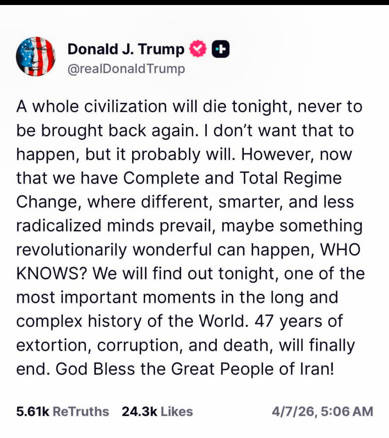 Last week, the incompetent and woefully unqualified Secretary of Defense Pete Hegseth went on a firing spree as he fired top generals in the Army. Last night, the Predator in Chief threatened to commit genocide against the Iranian people. Clearly these two things, the mass firing and the threat of genocide, are related. Hegseth wants loyalty to Trump in the ranks. He is a sycophant for a man who intentionally surrounds himself with losers. Pete probably thinks he’s not included in that group of losers, but he is. One day, I hope he loses bigly by being tried for crimes against humanity and war crimes. Before that happens, Trump will probably throw him under the bus though.